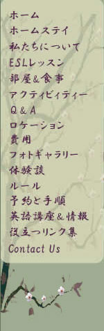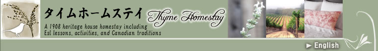 カナダの大自然に囲まれたカナダ人先生ホームステイ宅で1週間のプチ留学を満喫し英会話上達してみませんかタイムホームステイは、カナダのブリティッシュコロンビア州にあるのどかな街アームストロングでホームステイをしながら、実践に使えるESL(英語)レッスンやアクティビィティーを経験できるユニークなホームステイプログラムです。ESLの資格を持ったカナダ人の女性ティーチャー・コリーンと9歳のフレンドリーなイーデンと海外経験豊富な日本人男性が1週間おもてなしいたします。このタイムホームステイプログラム自体が私達のビジネスなのでほぼ一日中ホームステイファミリーと一緒に過ごすことができ、1週間でもかなり充実した留学経験ができると思います。 下記のページをご覧いただくとタイムホームステイ全般についてがわかるように1ページに要約してあります。 写真付きのタイムホームステイ体験談を読めばゲストからみたタイムホームステイの様子がわかると思います。 タイムホームステイを通し、カナダの文化や習慣や伝統、ESLレッスン、アクティビィティーをたっぷりと経験していただけます。 1908年に建てられ、文化遺産に指定された大きく雄大な家でホームステイをしていただけます。家の内部は、アンティークやフランス製の装飾品で装飾してあり、それぞれの部屋には、羽毛布団とキルトを用意してあります。家の内部の写真はコチラにあります。 ホームステイの家は、アームストロングという大自然に囲まれた場所にあるのでカナダの自然を楽しみ、ゆっくりとリラックスした時間を過ごすことができ、またアクティビティーなどを充分に楽しんでいただけますが、バーノン、ケローナ、エンダビー、サーモンアームといった街もまわりにあるのでおみやげなどのショッピングも楽んでいただけます。 ESLレッスンは、実際の生活の中でコミュニケーションがとれるようになるための英語レッスン、フィールドトリップ(例えば、コーヒーショップに一緒に行って、オーダーの仕方を練習するなど)、クッキングレッスン、ベーキングレッスンなどを行います。ESLレッスン以外にもアクティビィティーや生活の中で英会話を練習するチャンスがたくさんあります。 アクティビィティーは、ワイナリーやワイン試食ツアー、乗馬、スキー、スノーボード、アンティークショッピング、ラベンダー農園ツアー、ベリー摘み、伝統のあるオキーフ牧場ツアー、ハイキング、森の中にあるキャラバン劇場、フィッシング、スイミングやホワイトウォーターラフティング(急流での筏下り)などを行います。 食事は、オーガニックのハーブや新鮮で栄養のある材料を使ったものを用意していて参加者の方には好評をいただいております。 カナダサイトランキング |